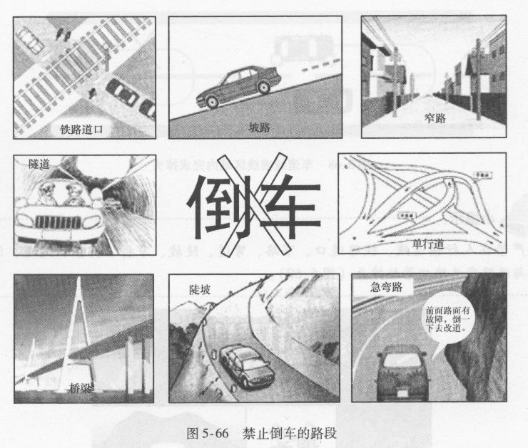 1)倒车应选择道路宽阔,视线良好,交通情况不太复杂的路段,在确保安全的情况下进行倒车。尽量避免在道路较差、视线不良、人员较多、交通情况复杂的路段倒车。禁止在铁路道口、交叉路口、单行线、弯路、窄路、桥梁、陡坡、隧道和交通繁华路段倒车(图5-66)。