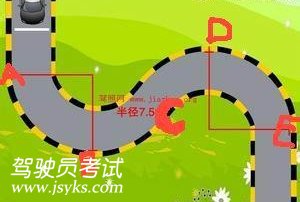S型弯道:S弯道对于刚摸车的人来说,打多少度,才不会压到线。如图见解,我们一般都是坐在左边的,车从上往下开。那么车的右前车角,在A点碰到右边的线的时候,就开始慢慢打方向(打多了就要回一点,来回调整,只要右前车角对着右边的线行驶就可以了),然后沿着右边的线慢慢行驶,然后在C点得时候,前车右边的车角只要不碰到右边的线,就可以回正方向盘。当左边的前车角碰到左边的线的时候,就可以打方向盘(一定要学会快速来回调整,车角沿着线走),如果速度没有把握好,车头碰到D点了,就要往右打一圈多一点,只要左边的前车角没有碰到E点,就可以立马回正方向盘了。