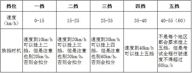具体的档位和速度的对应关系,因为驾考的政策不同,可能会与你所在的考场情况有所不同,不同的话就参考一下,大同小异。